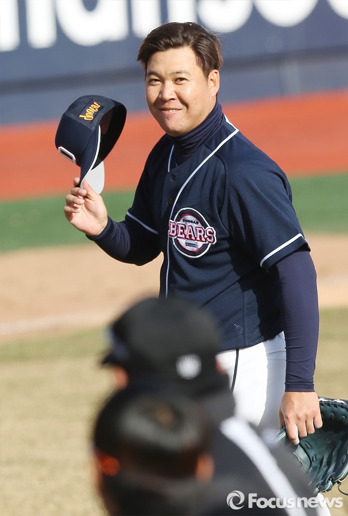 (수원=포커스뉴스) 9일 수원 kt위즈파크에서 열린 2016 KBO리그 시범경기 두산-kt 경기에서 두산 마무리 투수 이현승이 9회말 등판해 3자 범퇴로 경기를 마무리지은후 모자를 벗고 KT 덕아웃을 향해 인사하고 있다.