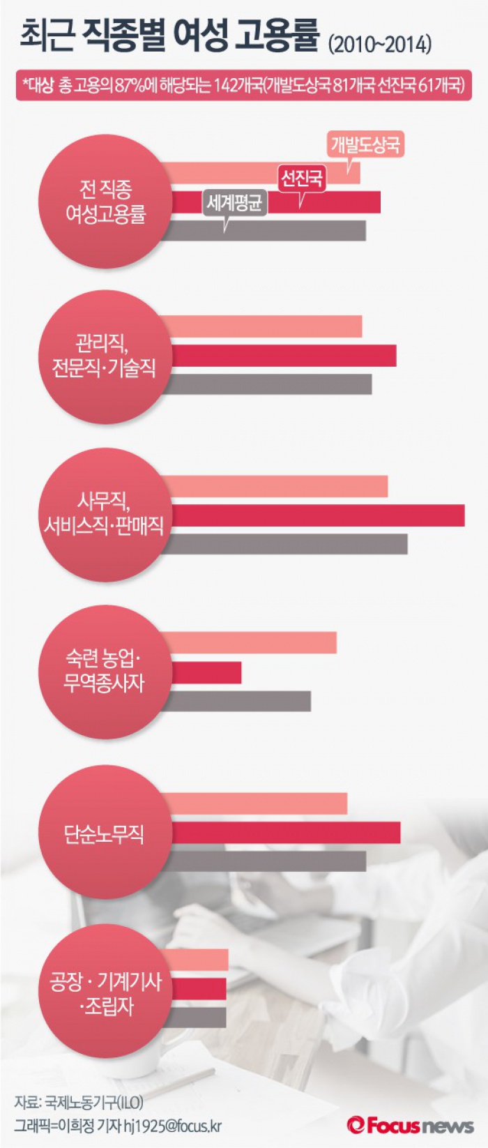 (서울=포커스뉴스) 국제노동기구(ILO)의 '2016 여성노동 동향 보고서'에 따르면 2010년부터 2014년의 직종별 여성고용률은 서비스직이나 판매직, 단순 노무직이 높았다. 반면 숙련 농업·무역 종사자, 기계기사 조립사와 같은 전문 직종의 고용률은 여전히 낮은 것으로 나타났다.