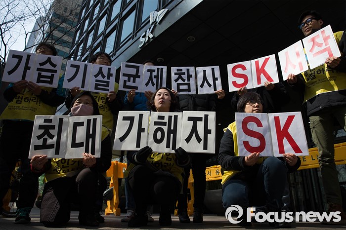 (서울=포커스뉴스) 9일 오전 서울 종로구 SK서린빌딩 앞에서 환경보건시민센터 회원들이 가습기살균제 사용 피해 책임을 요구하며 SK케미칼 전ㆍ현직 임원들의 처벌을 촉구하고 있다.
