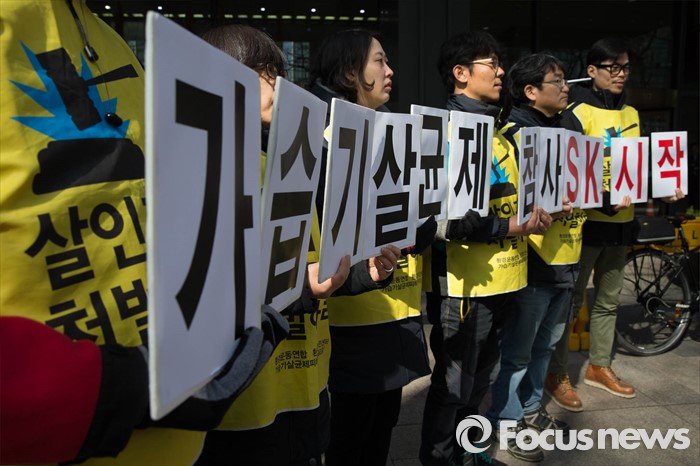 (서울=포커스뉴스) 9일 오전 서울 종로구 SK서린빌딩 앞에서 환경보건시민센터 회원들이 가습기살균제 사용 피해 책임을 요구하며 SK케미칼 전ㆍ현직 임원들의 처벌을 촉구하고 있다.