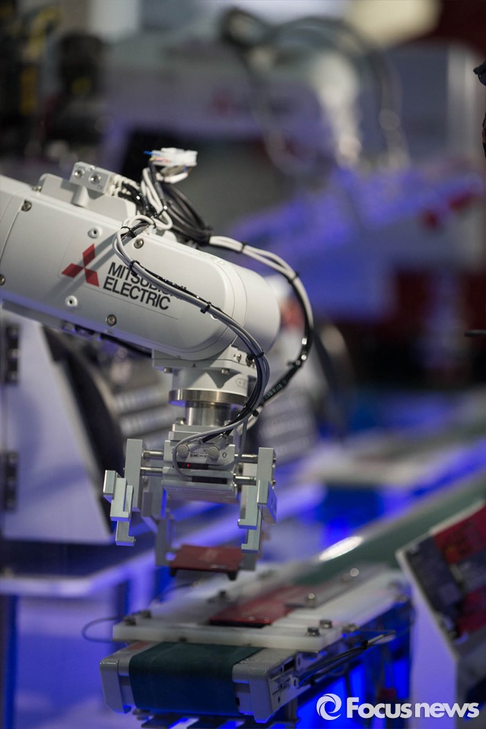 (서울=포커스 뉴스) 9일 오후 서울 강남구 코엑스에서 열린 '2016 오토메이션 월드 국제스마트공장, 자동화 전시회'에서 스카라로봇이 제품생산 과정을 시연하고 있다.