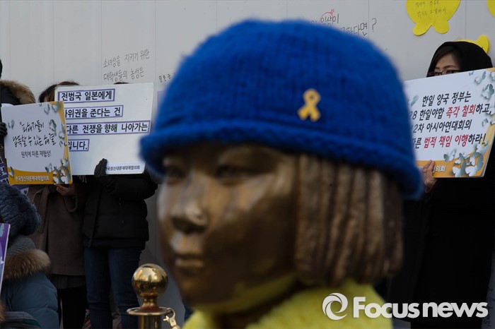(서울=포커스뉴스) 9일 오후 서울 종로구 옛 일본대사관 앞에서 열린 '일본군 위안부 문제해결을 위한 1221차 정기 수요집회'에서 참가자들이 일본정부의 공식 사과를 촉구하고 있다.
