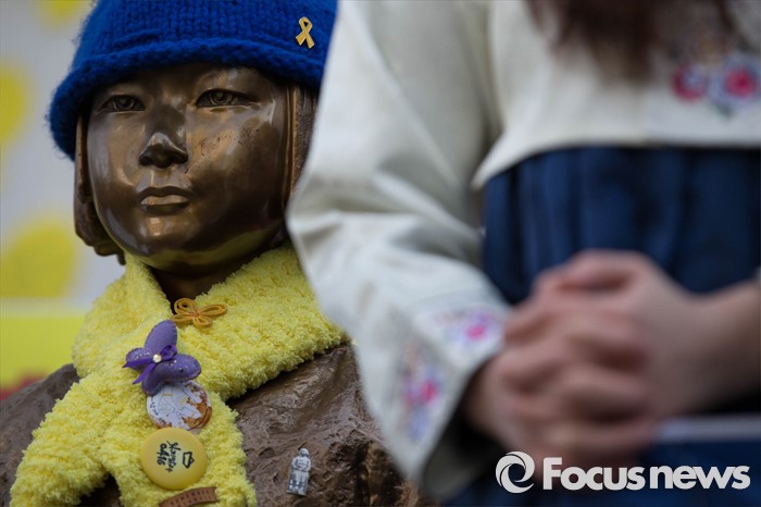 (서울=포커스뉴스) 9일 오후 서울 종로구 옛 일본대사관 앞에서 열린 '일본군 위안부 문제해결을 위한 1221차 정기 수요집회'에서 한 참가자가 한복을 입은 채 손을 모으고 있다.