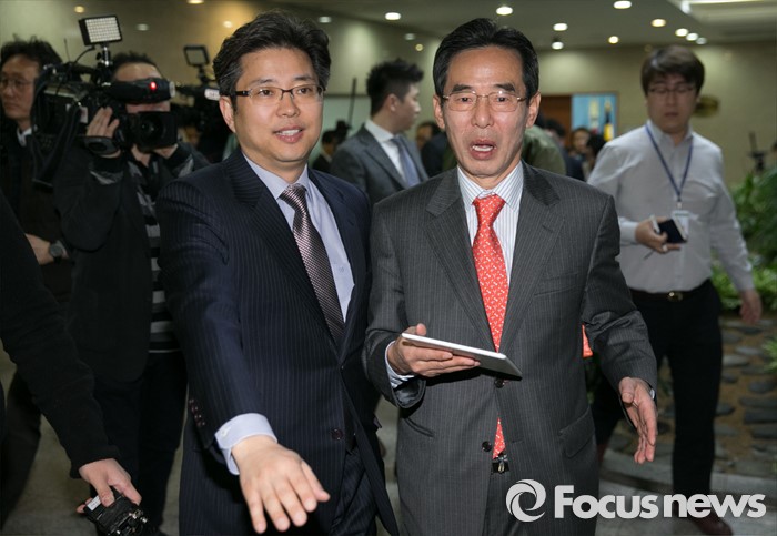 (서울=포커스뉴스) 홍창선(오른쪽) 더불어민주당 공천관리위원장이 10일 오전 서울 여의도 국회 정론관에서 20대 총선 경선 및 단수지역과 2차 공천배제(컷오프) 명단 발표를 마친 뒤 퇴장하고 있다.