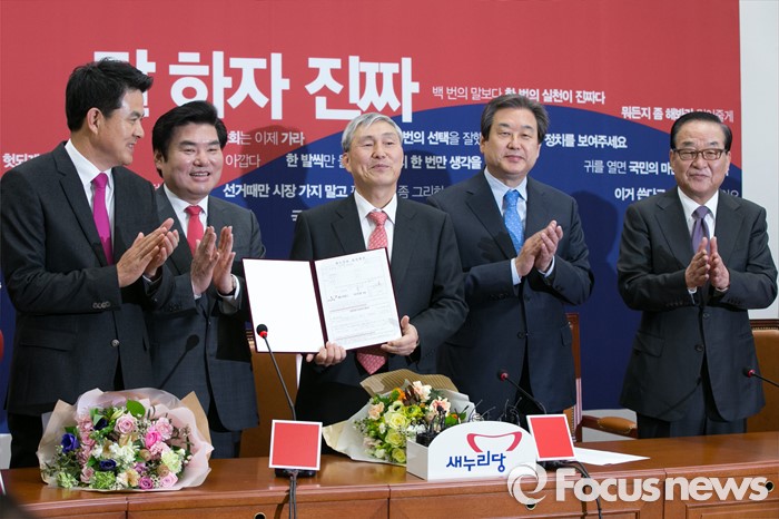 (서울=포커스뉴스) 프로바둑 조훈현(가운데) 9단이 10일 오전 서울 여의도 국회 새누리당 대표최고위원실에서 열린 입당식에 참석해 김무성(오른쪽 두번째) 대표, 원유철(왼쪽 두번째) 원내대표 등 지도부의 축하를 받고 있다.