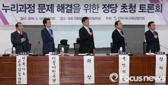 (서울=포커스뉴스) 10일 오전 서울 여의도 국회 의원회관에서 누리과정 문제해결을 위한 정당 초청 토론회에 앞서 참석자들이 국기에 대한 경례를 하고 있다. 왼쪽부터 장휘국 전국시도교육감협의회장, 이목희 더불어민주당 정책위의장, 성기선 한국교육사회학회 부회장, 장병완 국민의당 정책위의장, 정진후 정의당 원내대표.
