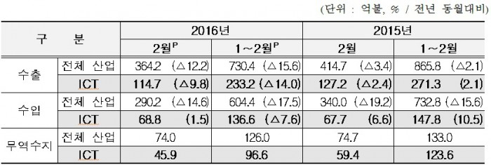 10일 미래창조과학부가 발표한 2월 ICT 수출은 전년 같은 월 대비 9.8% 감소한 114억7000달러다. 휴대폰, 컴퓨터 및 주변기기의 수출 증가세 전환에 힘입어 수출 감소세는 약화됐으나 반도체와 디스플레이 등 수출 주요품목의 부진은 여전했다.