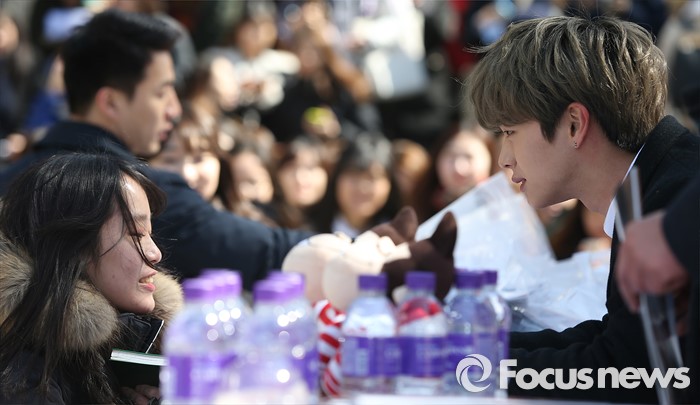 (서울=포커스뉴스) 10일 오후 서울 서대문구 이화여자대학교에서 열린 '캠퍼스 어택' 행사에 참석한 가수 육성재(오른쪽)가 한 팬에게 사인을 해주고 있다.