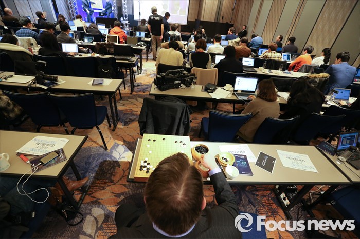 (서울=포커스뉴스) 10일 오후 서울 종로구 포시즌스호텔 기자실에서 한 외신 기자가 이세돌 9단과 구글 인공지능 알파고의 '구글 딥마인드 챌린지 매치' 2차 대국을 보며 직접 바둑을 두고 있다.