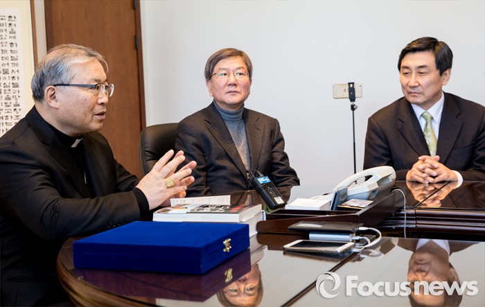 (서울=포커스뉴스) 10일 오후 서울 중구 명동성당에서 열린'장발장법 통과에 대한 감사패 전달식'에 참석한 염수정(왼쪽) 추기경과이종걸(오른쪽) 더불어민주당 원내대표가 생대화하고 있다.