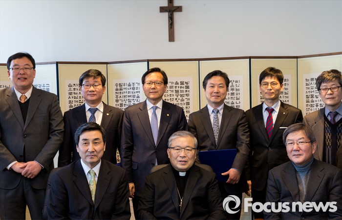 (서울=포커스뉴스) 10일 오후 서울 중구 명동성당에서 열린 '장발장법 통과에 대한 감사패 전달식'에서 이종걸(앞줄 맨 왼쪽) 더불어민주당 원내대표와 염수정 추기경을 비롯한 참석자들이 기념촬영을 갖고 있다.