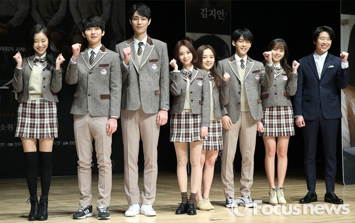 (서울=포커스뉴스) 10일 오후 서울 강남구 일지아트홀에서 열린 웹드라마 '악몽선생' 제작발표회에 참석한 출연진들이 포토타임을 갖고 있다. 왼쪽부터 김지안, 장경업, 감다예, 서신애, 이민혁, 김소현, 엄기준.