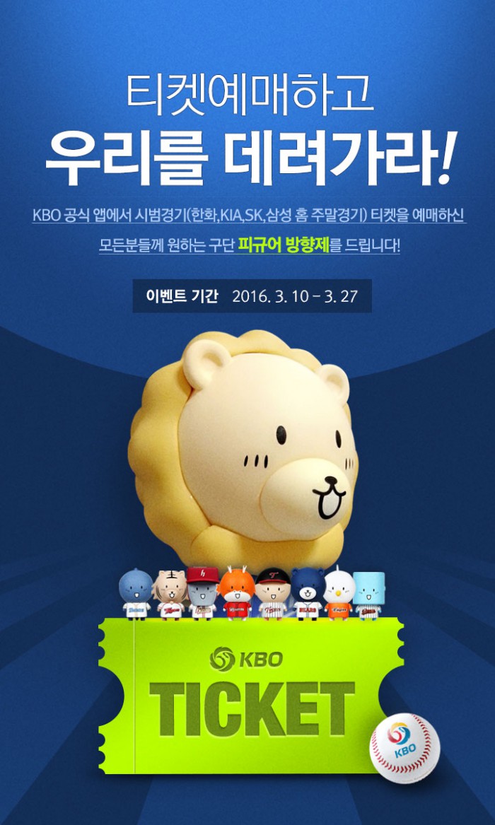 KBO는 10일부터 27일까지 공식앱으로 한화, KIA, SK, 삼성의 시범경기 주말 홈경기 티켓을 예매한 모두에게 원하는 구단 캐릭터 방향제 1개를 준다. 예매를 취소하거나 경기가 우천 취소되면 경품을 제공하지 않는다.