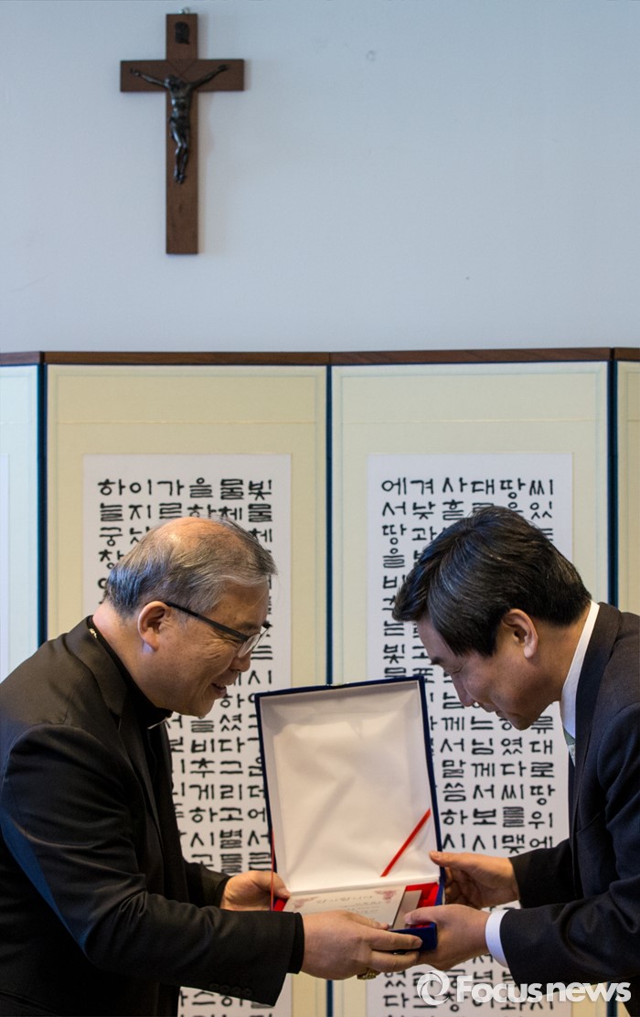 (서울=포커스뉴스) 10일 오후 서울 중구 명동성당에서 이종걸(오른쪽) 더불어민주당 원내대표가 염수정 추기경으로부터 장발장법 통과에 대한 감사패를 전달받고 있다.
