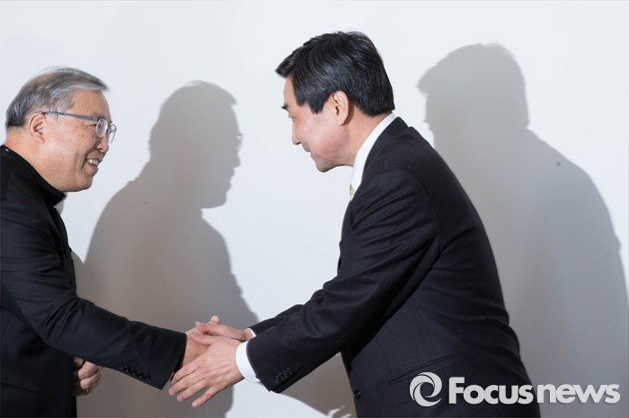 (서울=포커스뉴스) 10일 오후 서울 중구 명동성당에서 열린'장발장법 통과에 대한 감사패 전달식'에 참석한이종걸(오른쪽) 더불어민주당 원내대표가 염수정(왼쪽) 추기경과 악수하고 있다.