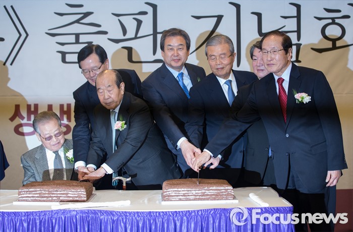 (서울=포커스뉴스) 10일 오후 서울 종로구 세종문화회관에서 열린 김종필 전 국무총리 출판기념회에서 국회의장 및 3당 대표들이 출판 기념 컷팅식을 하고 있다. 왼쪽부터 김종필 전 국무총리 정의화 국회의장, 김수한 전 국회의장, 김무성 새누리당 대표. 김종인 더불어민주당 비상대책위원회 대표, 안철수 국민의당 상임공동대표, 신경식 대한민국헌정회장.