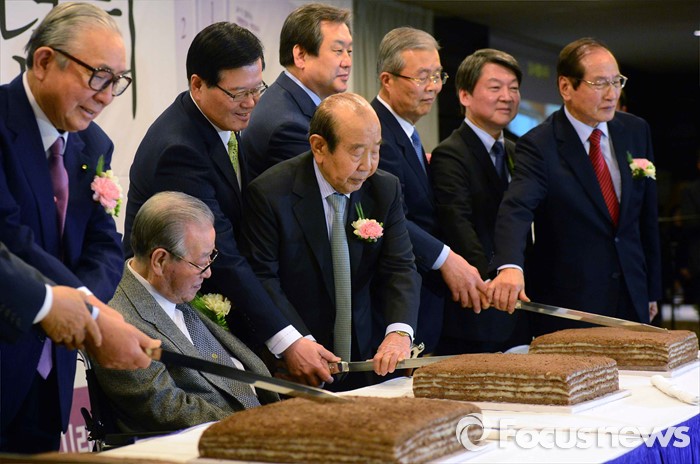 (서울=포커스뉴스) 김종필 전 국무총리와 내빈들이 10일 오후 서울 종로구 세종문화회관 세종홀에서 열린 자신의 정치인생을 담은 '김종필 증언록' 출판기념회에 참석해 축하 떡을 자르고 있다. 왼쪽 두번째부터 김 전 총리, 정의화 국회의장, 김수한 전 국회의장, 김무성 새누리당 대표, 김종인 더불어민주당 비대위 대표, 안철수 국민의당 상임공동대표, 신경식 대한민국헌정회장.