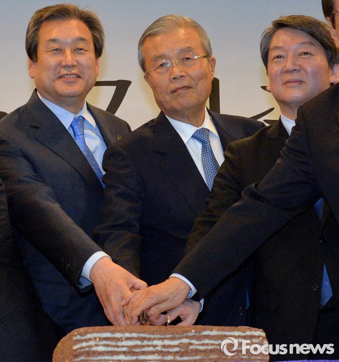 (서울=포커스뉴스) 김무성(왼쪽부터) 새누리당 대표, 김종인 더불어민주당 비대위 대표, 안철수 국민의당 상임공동대표가 10일 오후 서울 종로구 세종문화회관 세종홀에서 열린 김종필 전 국무총리의 '김종필 증언록' 출판기념회에 참석해 축하 떡을 자르고 있다.