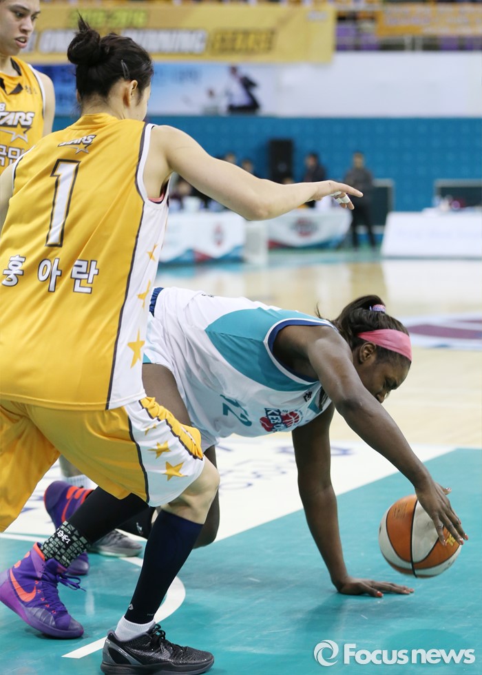 (부천=포커스뉴스) 10일 부천체육관에서 열린 2015-2016 여자프로농구 PO 1차전 KEB하나-KB스타즈 경기에서 KEB하나 첼시 리가 KB스타즈 홍아란에 앞서 리바운드볼을 잡다 넘어지고 있다.