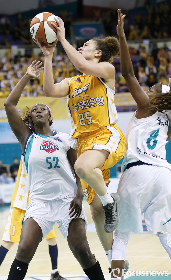 (부천=포커스뉴스) 10일 부천체육관에서 열린 2015-2016 여자프로농구 PO 1차전 KEB하나-KB스타즈 경기에서 KB스타즈 햄비가 KEB하나 첼시 리와 모스비의 마크를 뚫으며 레이업슛을 시도하고 있다.
