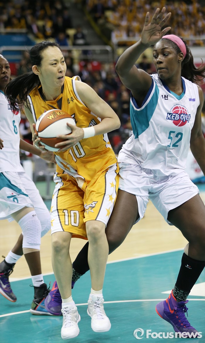 (부천=포커스뉴스) 10일 부천체육관에서 열린 2015-2016 여자프로농구 PO 1차전 KEB하나-KB스타즈 경기에서 KB스타즈 변연하가 KEB하나 첼시 리의 마크에 패스할 곳을 찾고 있다.