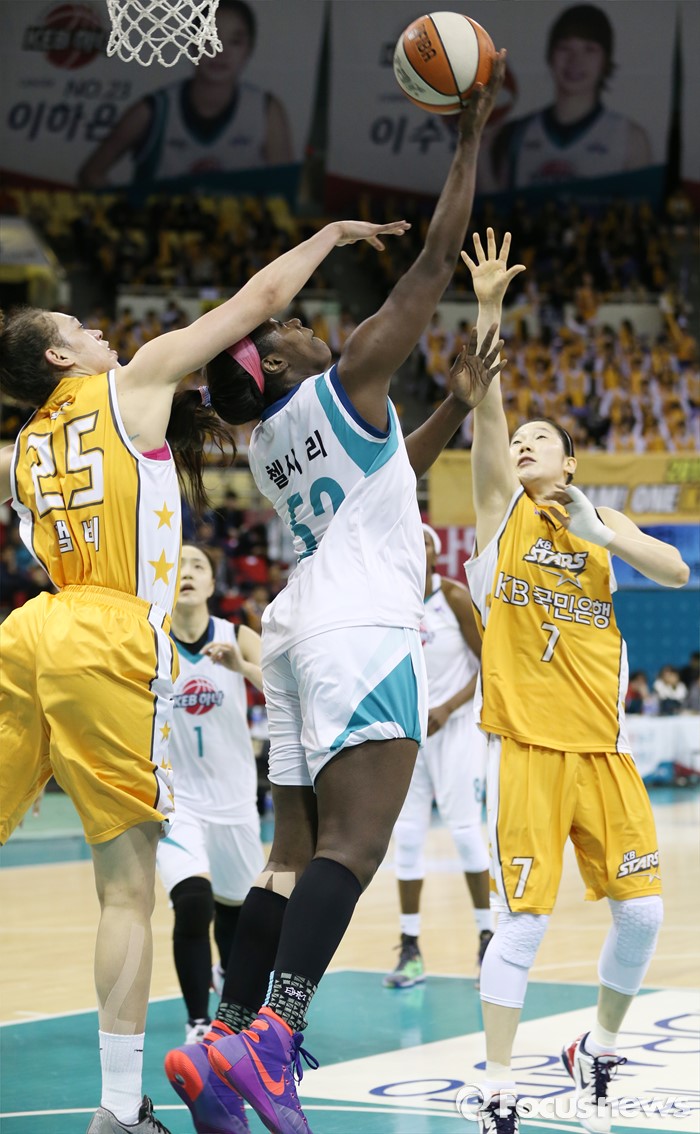(부천=포커스뉴스) 10일 부천체육관에서 열린 2015-2016 여자프로농구 PO 1차전 KEB하나-KB스타즈 경기에서 KEB하나 첼시 리가 KB스타즈 햄비의 슛블록을 피하며 리버스 레이업슛을 쏘고 있다.