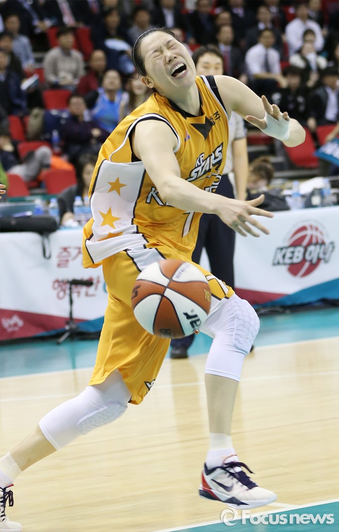 (부천=포커스뉴스) 10일 부천체육관에서 열린 2015-2016 여자프로농구 PO 1차전 KEB하나-KB스타즈 경기에서 KB스타즈 강아정이 KEB하나 강이슬의 파울에 볼을 놓치고 있다.
