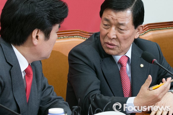 (서울=포커스뉴스) 원유철(왼쪽) 새누리당 원내대표와 황진하 사무총장이 11일 오전 서울 여의도 국회에서 열린 원내대책회의에 참석해 대화하고 있다. 앞서, 지난 10일 황 사무총장은 이한구 공관위원장이 독선적으로 공관위를 운영한다며 회의 불참을 선언했다.