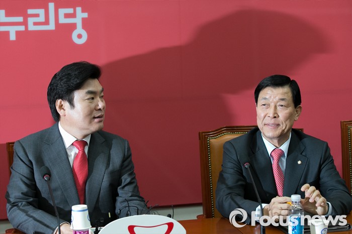 (서울=포커스뉴스) 원유철(왼쪽) 새누리당 원내대표와 황진하 사무총장이 11일 오전 서울 여의도 국회에서 열린 원내대책회의에 참석해 자리에 앉아 있다. 앞서, 지난 10일 황 사무총장은 이한구 공관위원장이 독선적으로 공관위를 운영한다며 회의 불참을 선언했다.