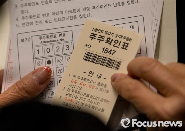 (서울=포커스뉴스) 11일 오전 서울 서초구 삼성전자 본사 다목적홀에서 열린 47기 정기주주총회에 참석한 한 주주가 주주확인표와 표결용지를 확인하고 있다.