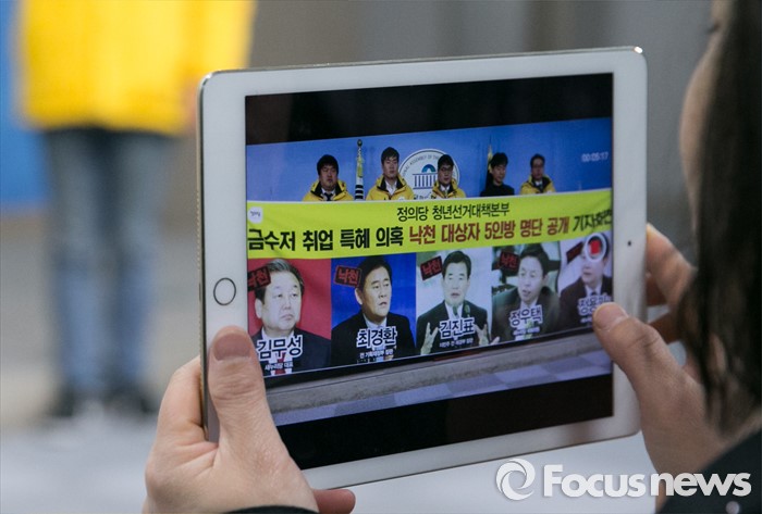 (서울=포커스뉴스) 11일 오전 서울 여의도 국회 정론관에서 한 참석자가 정의당 청년선대본부의 금수저 취업 특혜 의혹 5인방 공천 낙마 촉구 기자회견을 촬영하고 있다. 이날 명단에 발표된 5인방은 김무성 새누리당 대표, 최경환, 정우택, 정용기 의원, 김진표 전 더불어민주당 의원이다.