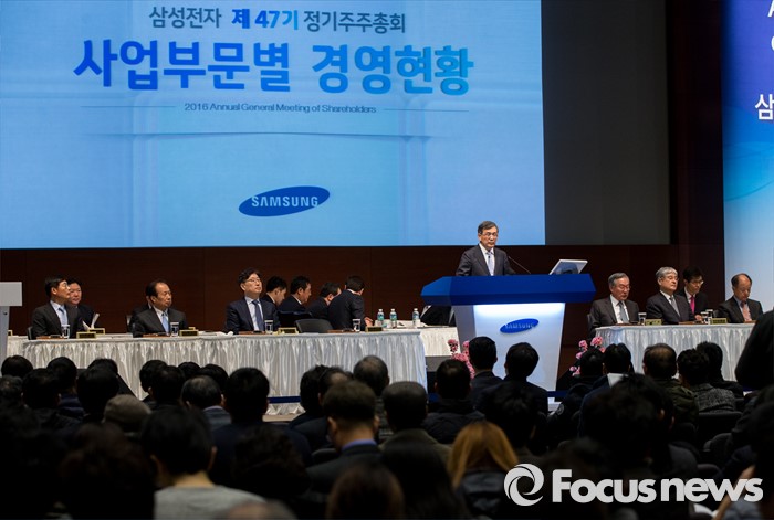 (서울=포커스뉴스) 11일 오전 서울 서초구 삼성전자 본사 다목적홀에서 열린 47기 정기주주총회에 참석한 권오현 이사회 의장(대표이사 부회장)이 DS사업 경영현황을 소개하고 있다.