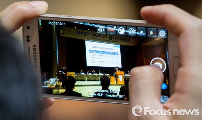 (서울=포커스뉴스) 11일 오전 서울 강남구 포스코센터에서 열린 정기주주총회에 참석한 한 주주가 포스코의 최대주주와의 거래내역을 촬영하고 있다.