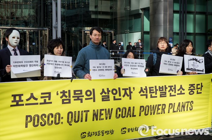 (서울=포커스뉴스) 11일 오전 서울 강남구 포스코센터 앞에서 환경운동연합 회원들이 포스코의 석탄화력발전소 추진을 규탄하는 기자회견을 갖고 있다.