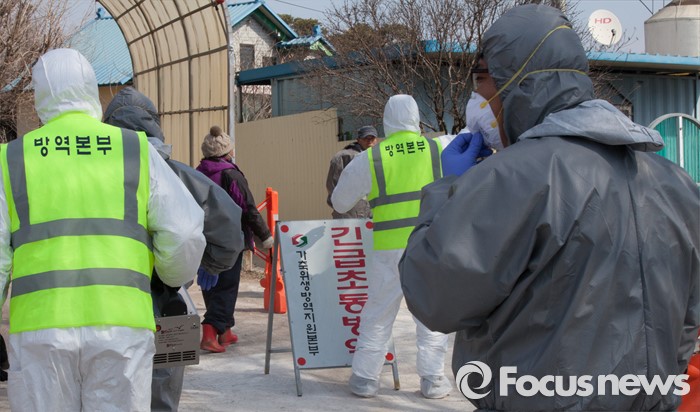 (논산=포커스뉴스) 지난 10일 충남 논산 광석면 소재 돼지농가에서 구제역 의심신고가 접수된 돼지가 11일 확진판정을 받은 가운데 농장이 위치한 마을 입구에서 방역 관계자들이 방역작업을 하고 있다. 해당 농가에서 사육중인 돼지 400마리는 모두 매몰 처분 됐으며, 이번 구제역 추가로 확인됨에 따라 충남지역에서만 5건의 구제역이 발생했다.