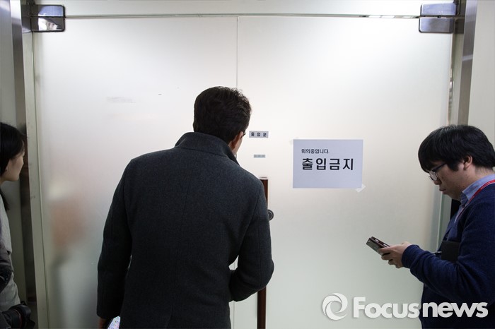 (서울=포커스뉴스) 11일 오전 서울 영등포구 중소기업중앙회에 마련된 개성공단기업협회 사무실에서 정기섭 회장을 비롯한 임원들이 북한당국의 개성공단 자산 청산통보에 대한 입주기업의 입장을 발표하기에 앞서 논의를 하고 있는 가운데 밖에서 취재진들이 대기하고 있다.