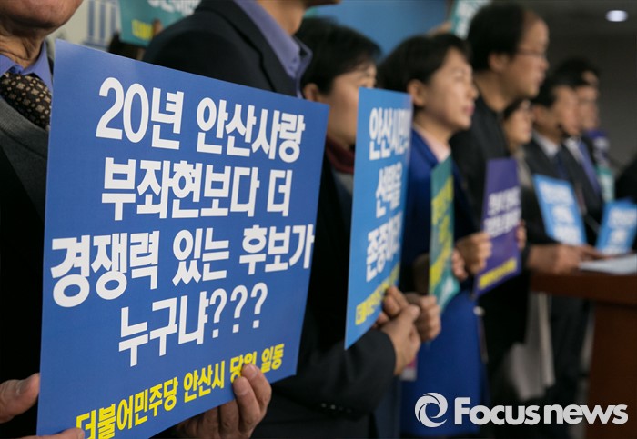 (서울=포커스뉴스) 11일 오후 서울 여의도 국회 정론관에서 더불어민주당 공천관리위원회 2차 공천배제(컷오프) 명단에 포함된 부좌현 의원의 지역구 당원들이 발표 철회를 촉구하는 기자회견을 하고 있다.