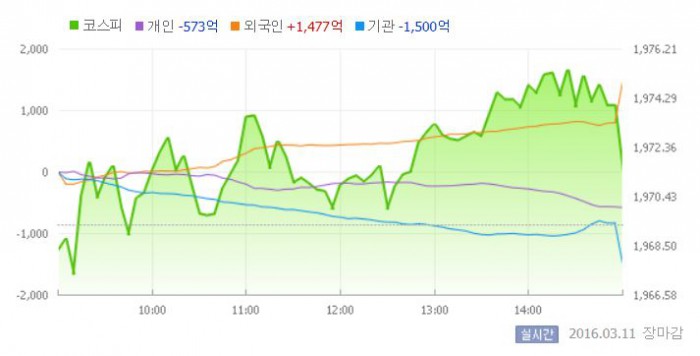11일 코스피지수는 전일 대비 0.11%(2.08포인트) 오른 1971.41에 장을 마쳤다. 코스피가 1970선을 돌파한 것은 종가 기준으로 올 들어 처음이다.
