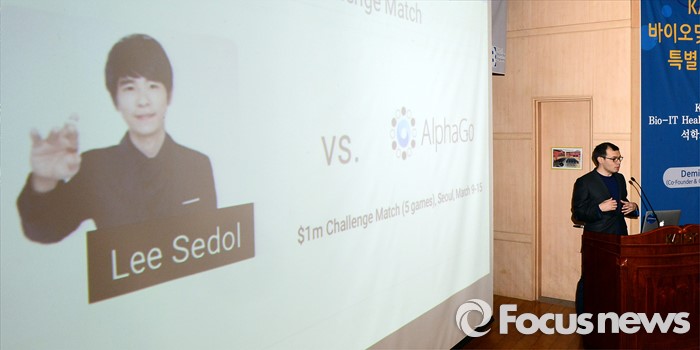 (대전=포커스뉴스) 이세돌 9단과 겨루는 인공지능 컴퓨터 알파고를 개발한 구글 딥마인드 최고경영자 데미스 하사비스가 11일 오후 대전 유성구 한국과학기술원에서 '인공지능과 미래' 라는 주제로 강연을 하고 있다.