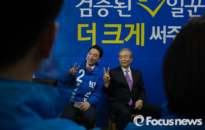 (공주=포커스뉴스) 김종인 더불어민주당 대표가 11일 오후 충남 공주시에서 열린 더불어민주당 박수현 의원의 선거사무소 개소식에 참석, 박 의원과 함께 사진촬영을 하고 있다.
