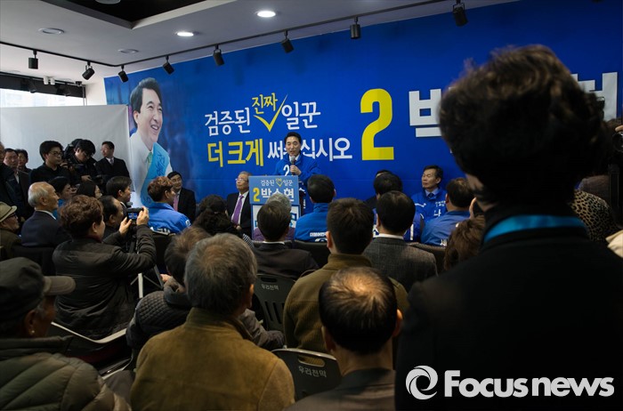 (공주=포커스뉴스) 11일 오후 충남 공주시에서 열린 더민주 박수현 의원의 선거사무소 개소식에서 박 의원이 출마선언을 하고 있다.