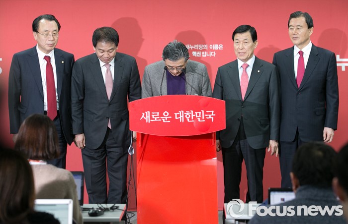 (서울=포커스뉴스) 이한구 새누리당 공천관리위원장과 위원들이 11일 오후 서울 여의도 당사에서 공관위 내부 갈등 등에 대해 사과하는 내용의 기자회견을 하고 있다. 왼쪽부터 김회선, 박종희 위원, 이 위원장, 황진하 부위원장, 홍문표 위원.