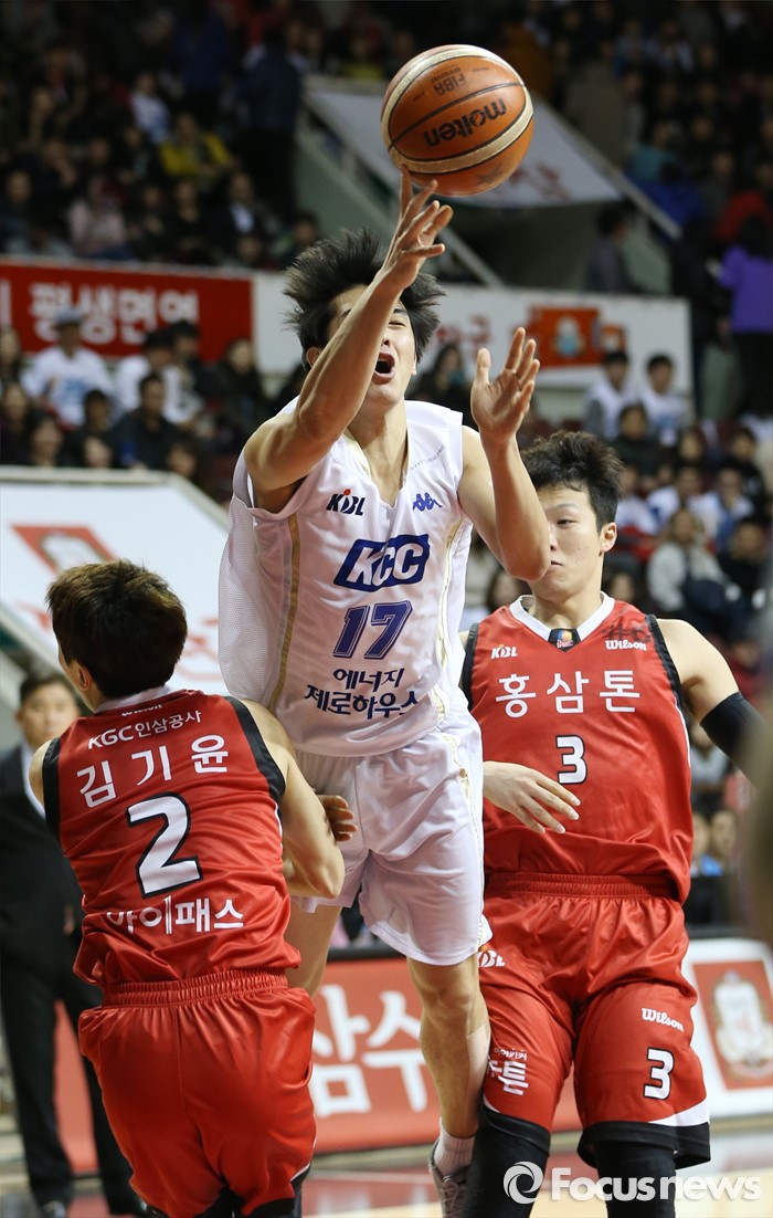 (안양=포커스뉴스) 11일 안양실내체육관에서 열린 2015-2016 프로농구 KGC-KCC 4강플레이오프 3차전에서 KCC 신명호가 KGC 김기윤과 이정현의 수비 사이로 레이업슛을 시도하고 있다.