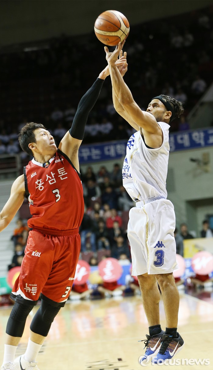 (안양=포커스뉴스) 11일 안양실내체육관에서 열린 2015-2016 프로농구 KGC-KCC 4강플레이오프 3차전에서 KCC 전태풍이 KGC 이정현의 마크를 피해 외곽슛을 쏘고 있다.