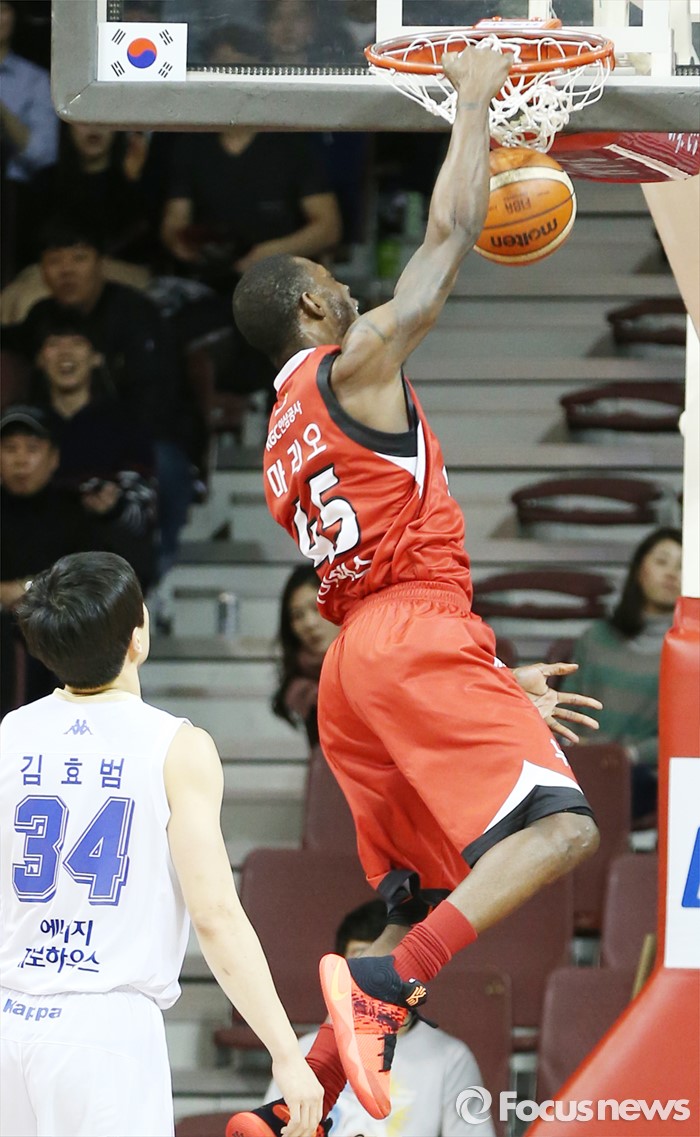 (안양=포커스뉴스) 11일 안양실내체육관에서 열린 2015-2016 프로농구 KGC-KCC 4강플레이오프 3차전에서 KGC 마리오 리틀이 원핸드 덩크를 림 안에 꽂아 넣고 있다.