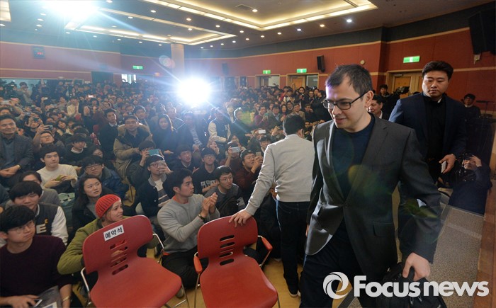 (대전=포커스뉴스) 이세돌 9단과 겨루는 인공지능 컴퓨터 알파고를 개발한 구글 딥마인드 최고경영자 데미스 하사비스가 11일 오후 대전 유성구 한국과학기술원(KAIST)에서 '인공지능과 미래' 라는 주제로 강연 후 강의장을 나서고 있다.