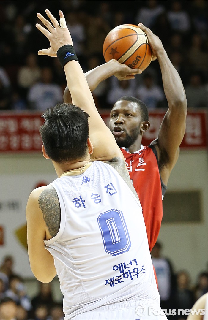 (안양=포커스뉴스) 11일 안양실내체육관에서 열린 2015-2016 프로농구 KGC-KCC 4강플레이오프 3차전에서 KGC 마리오 리틀이 연장 전에서 KCC 하승진의 블록을 피해 점프슛을 쏘고 있다.