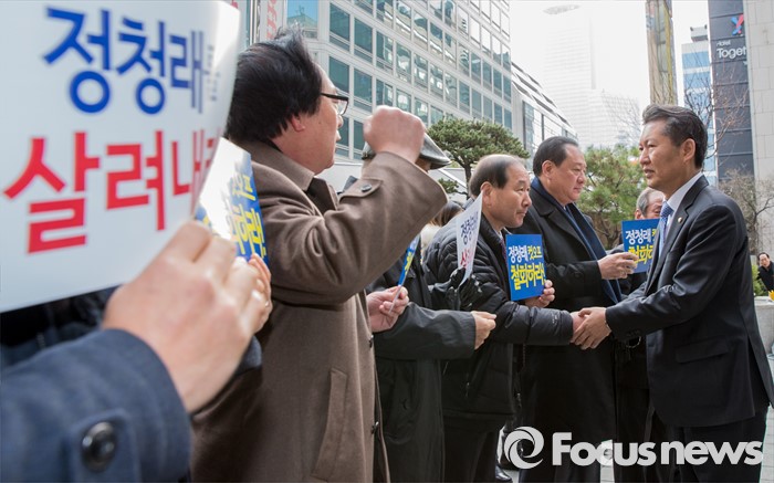 (서울=포커스뉴스) 20대 총선 공천 배제된 정청래 더불어민주당 의원이 12일 오전 공직선거후보자추천재심위원회에 재심신청서를 제출하기 위해 서울 여의도 더민주 당사를 향하며 지지자들과 인사하고 있다.