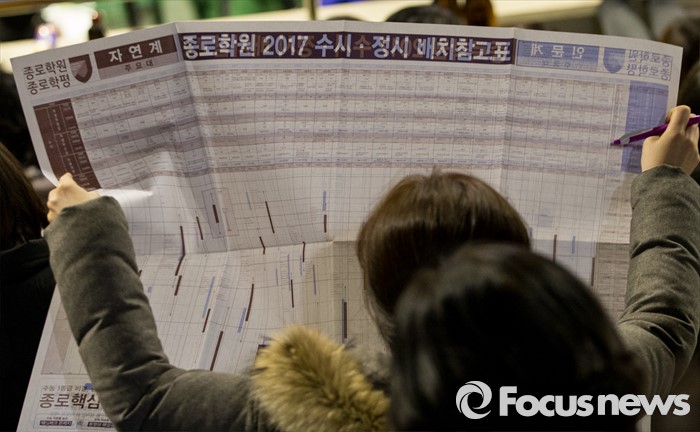 (서울=포커스뉴스) 12일 오후 서울 성동구 한양대학교 올림픽체육관에서 열린 '2017학년도 대학입시설명회'에 참석한 한 학부형이 주요 대학 배치참고표를 보고 있다.