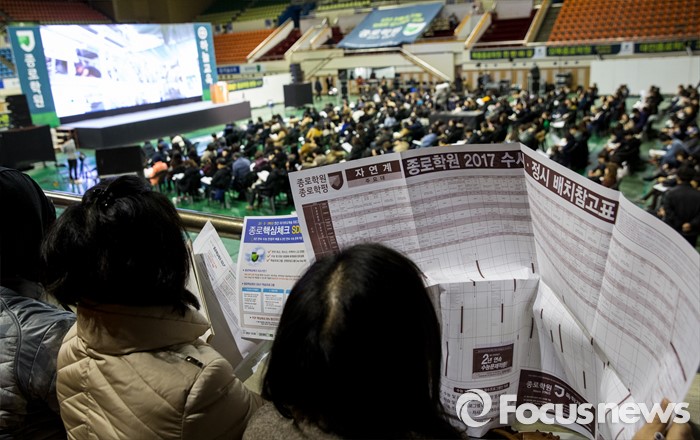 (서울=포커스뉴스) 12일 오후 서울 성동구 한양대학교 올림픽체육관에서 열린 '2017학년도 대학입시설명회'에 참석한 학부형, 수험생 및 관계자들이 주요 대학 배치참고표를 보고 있다.